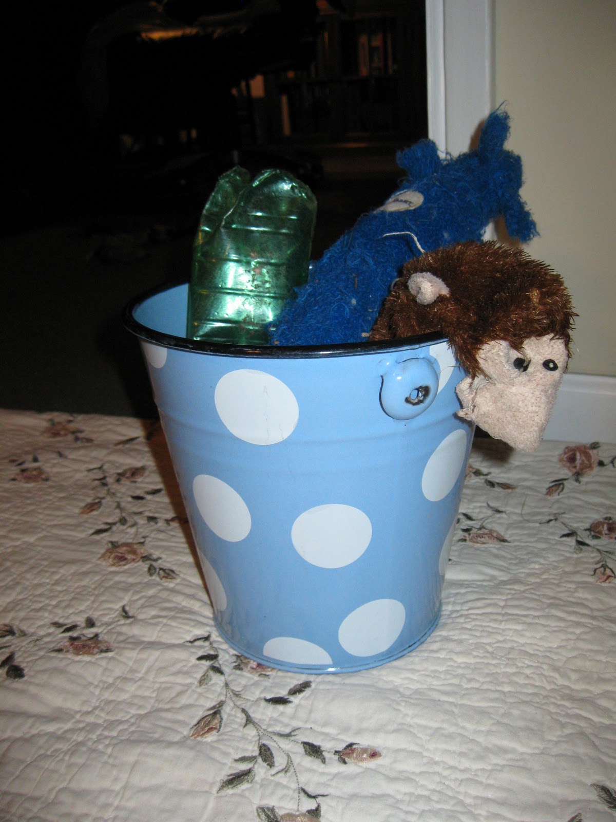 We have a little toy bucket for her, a treasure trove of her favorite things. Yesterday I noticed she put one or Rman's socks and her dog food bowl in the bucket. She normally just removes things but apparently is getting the idea of putting things away.